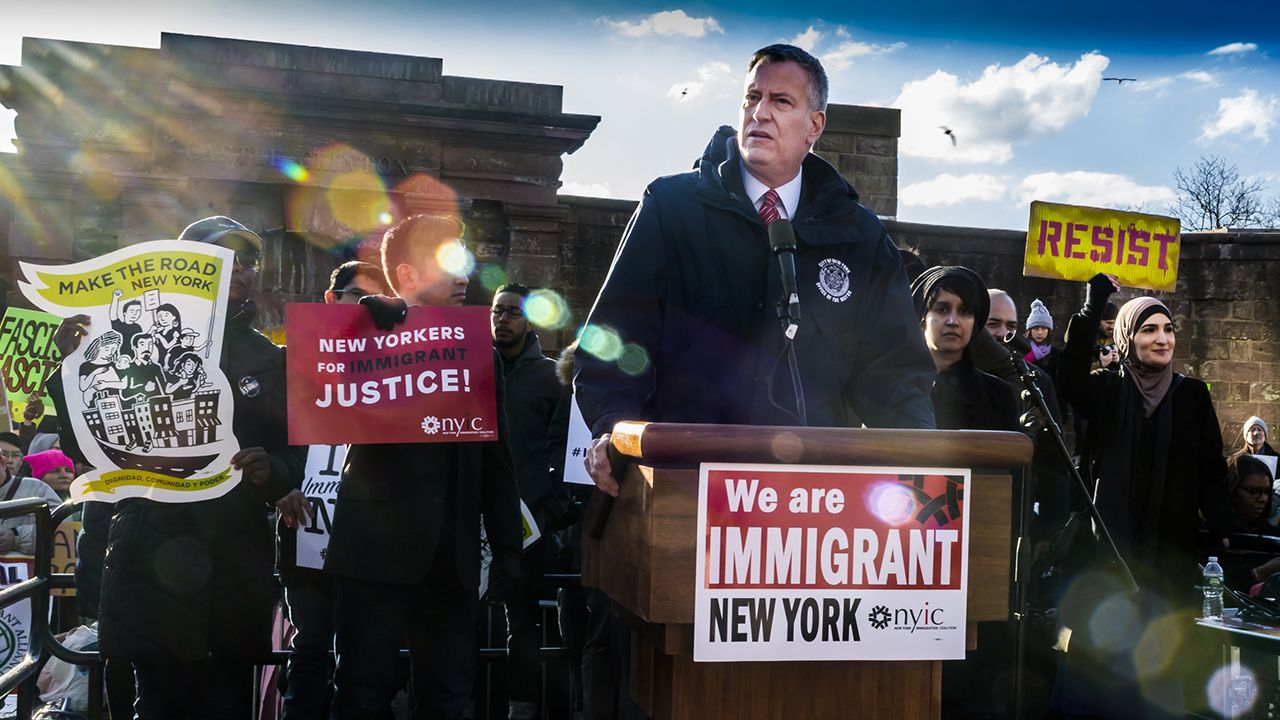 Мэр Нью-Йорка Билл Де Блазио обращается к тысячам протестующих против указа Трампа