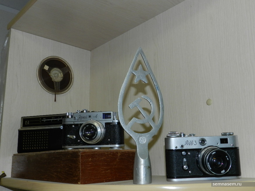 Посещение офиса «Мемориала» похоже на экскурсию. Стойка с вещами из прошлого: фотоаппараты «Зенит» и «ФЭД», печатная машинка, кассетный магнитофон, продуктовые талоны, початая пачка «Беломора» — весь бытовой дефицит граждан страны, которой больше нет на карте. Полное ощущение того, что хозяин просто вышел на минутку в хлебный магазин с непременным атрибутом всех советских покупателей — авоськой.