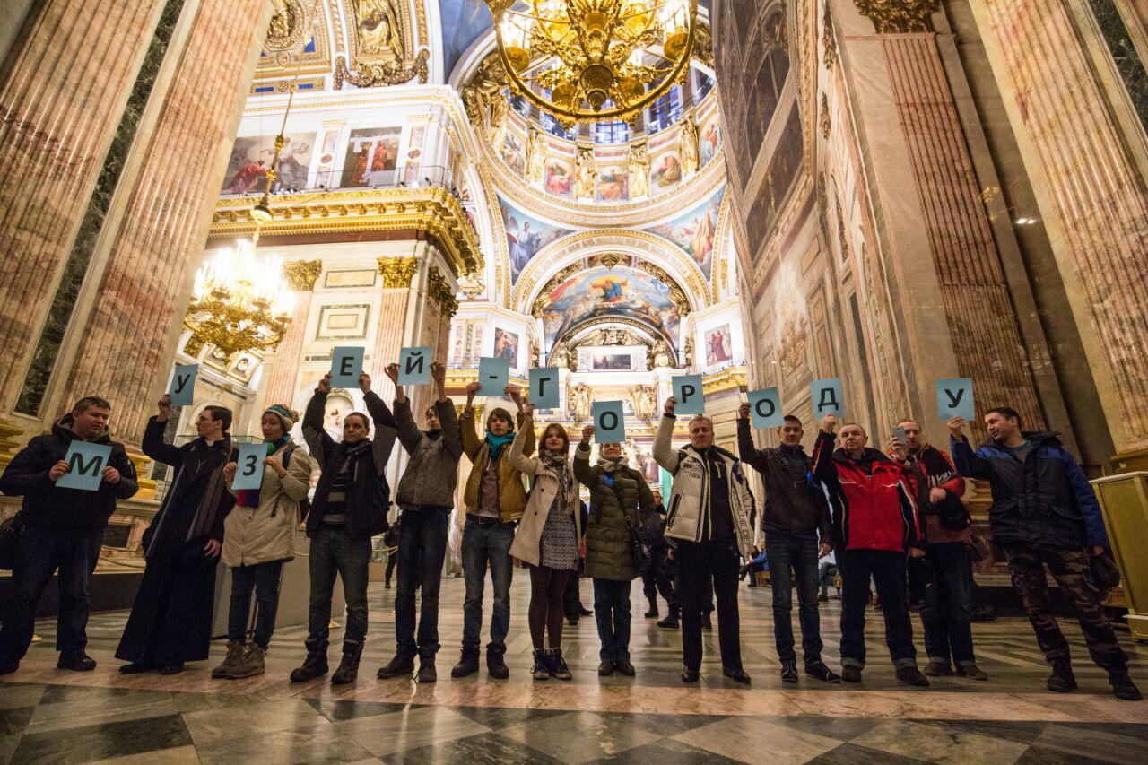 После сбора на Марсовом представители оппозиционных движений устроили еще одну акцию в самом соборе во время службы. Активисты подняли таблички с надписью «Музей — городу!» и начали фотографироваться на фоне священников. В 16:00 в соборе началась служба и его закрыли для посетителей, но успевшие пройти по билетам активисты остались внутри. Около десяти человек отказывались покинуть собор, но сотрудники музея уговорили их уйти.