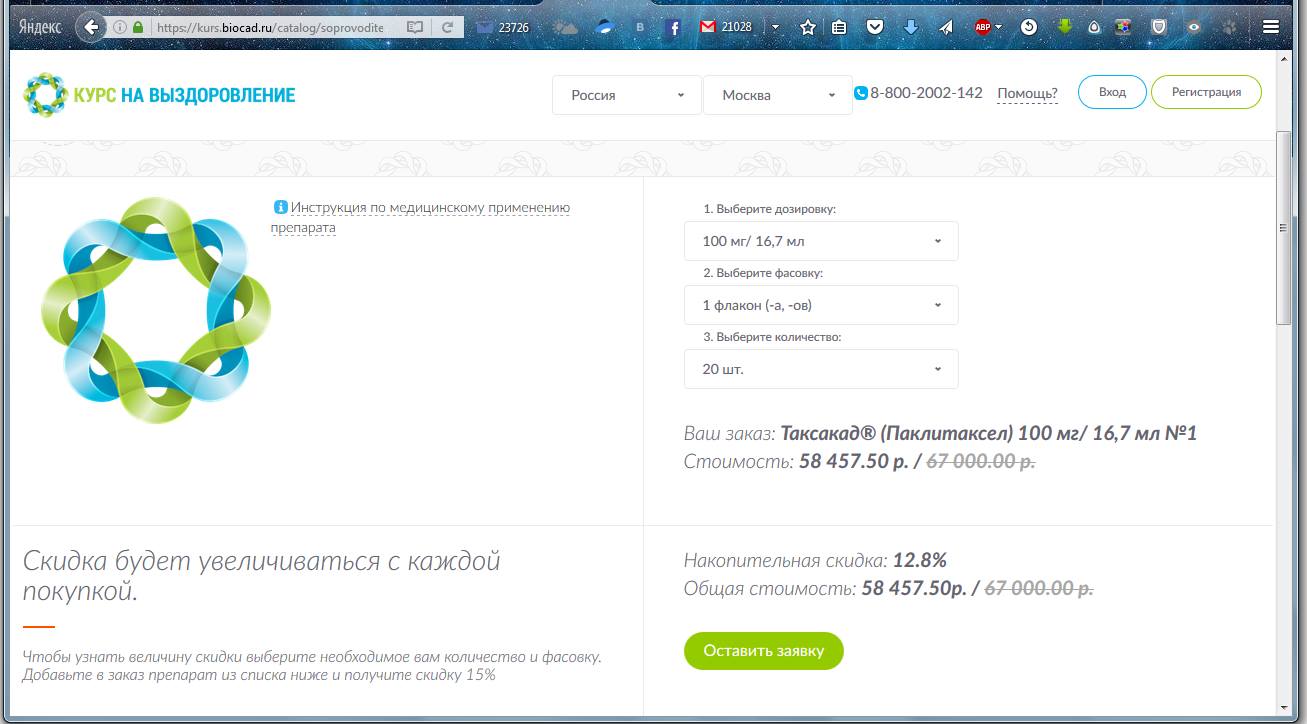 Стоимость 20 ампул препарата Таксакад при покупке в розницу на сайте производителя Фото: stalic.livejournal.com