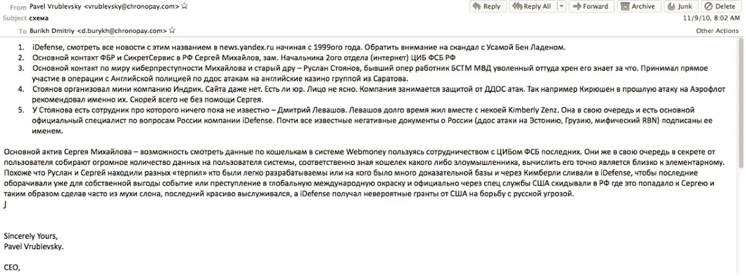 В этом подробном комментарии Кребс опубликовал и скриншот электронного письма, написанного еще в сентябре 2010 года известным российским IT-бизнесменом, основателем и руководителем процессинговой компании Chronopay Павлом Врублевским. Переписка Врублевского была похищена в 2011 году. Тогда же она попала к Брайану Кребсу. Но обнародовал Кребс это письмо лишь 28 января 2017 года. Вот скриншот:
