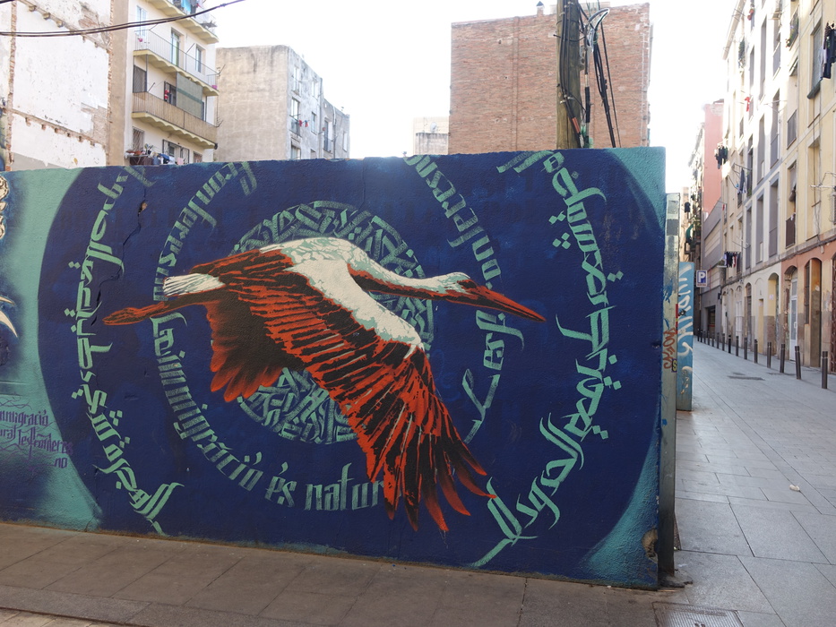 В столице Каталонии, Барселоне, есть квартал Раваль. Вы наверняка видели Кота Раваля, огромный фигуративистский памятник работы Фернандо Ботеро – это один из символов города. Так вот недалеко от этого Кота, на одной из улиц, каррер Аурора, есть огромная уличная фреска.