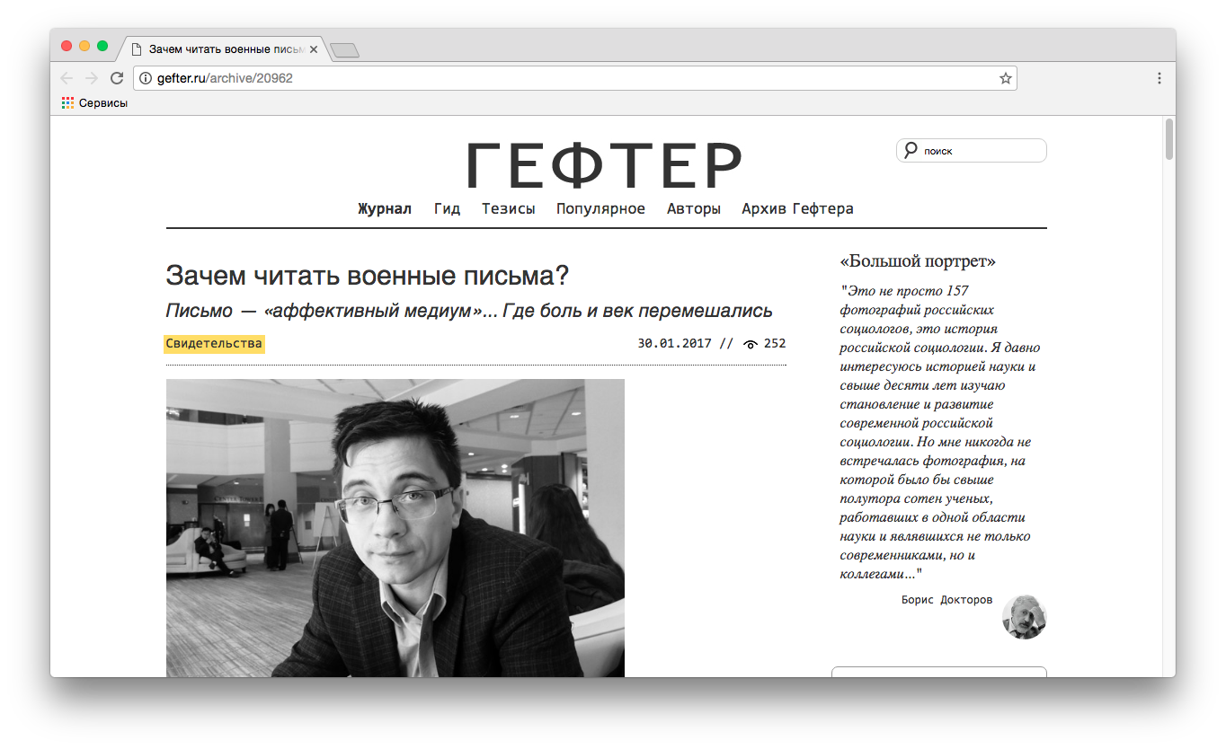 7. На «Гефтере» Михаил Немцев разговаривает с историком Алексеем Голубевым, составителем недавно вышедшего в НЛО собрания «XX век: письма войны». Голубев говорит о военных письмах как о вместилище крайне разнообразного опыта и уделяет особое внимание вопросу цензуры: «Человек [на фронте Великой Отечественной] пишет: здесь полный бардак. Или описывает, как их мобилизовали и как они шли пешком три дня практически без снаряжения, чуть ли не в лаптях. У нас есть такие цитаты. Цензоры их вымарывают, потому что при этом обнажается тот факт, что хотя Красная армия боеспособна, но у нее есть проблемы. И та часть, в которой речь шла о проблемах, вымарывалась. А, допустим, в письмах с Чеченской войны весь этот бардак расписан — отчасти, возможно, потому что все-таки до определенной степени это была неофициальная война». По словам Голубева, несмотря на распространение мобильной связи, жанр военного письма сохраняется до сих пор, пусть в имитативном виде: «Прилепин же пишет письма с Донбасса».