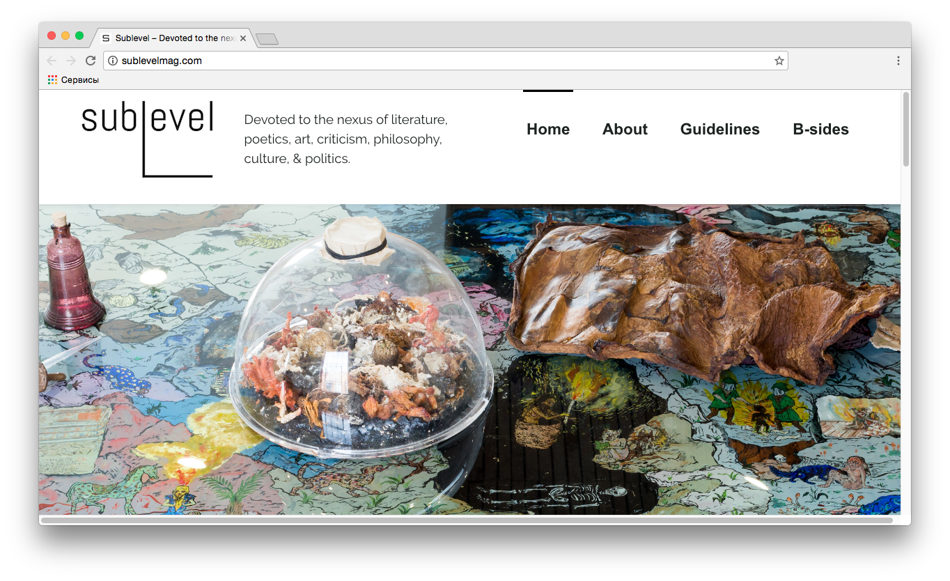 10. На этой неделе запустился сетевой литературный журнал Sublevel. Делают его участники программы creative writing в Калифорнийском институте искусств. Журнал будет тематическим, тема первого выпуска — «Заражение» (здесь хочется вспомнить восхитительный русский проект «Лесная газета», который тоже занимается тематизированием абстракций). В номере можно найти, например, специально написанные тексты в стихах и прозе об истории прикосновений и разговор поэтов Солмаз Шариф и Рики Лаурентиса о том, что происходит, когда текст выносится на публику (заражается наблюдением): «В разговоре о текстах, который мы ведем между собой, вполне достаточно критиковать, убирать что-то, называть то, что мы не хотим делать. На публике это отдает высокомерием… — говорит Шариф. — На публике такую позицию занять легко. Вот что я стала в последнее время ненавидеть в фейсбуке. А сложнее будет создавать, говорить утвердительно о том, чего мы хотим от литературы, от публики, от политического: делая это, мы выставляем себя как предметы, подлежащие уничтожению». Перед нами размышления о том, как сам факт публичного высказывания врастает в контекст и делается контекстом — от неловкости публичного чтения стихов до политических заявлений (здесь в качестве примера приводятся гневные слова Саманты Пауэр о бомбардировках Алеппо, противопоставленные ее же высказыванию 2003 года о том, что война в Ираке сделает жизнь иракцев лучше).