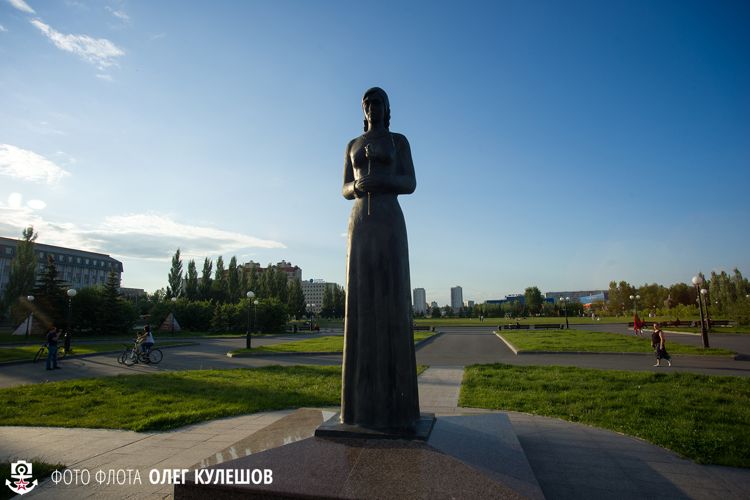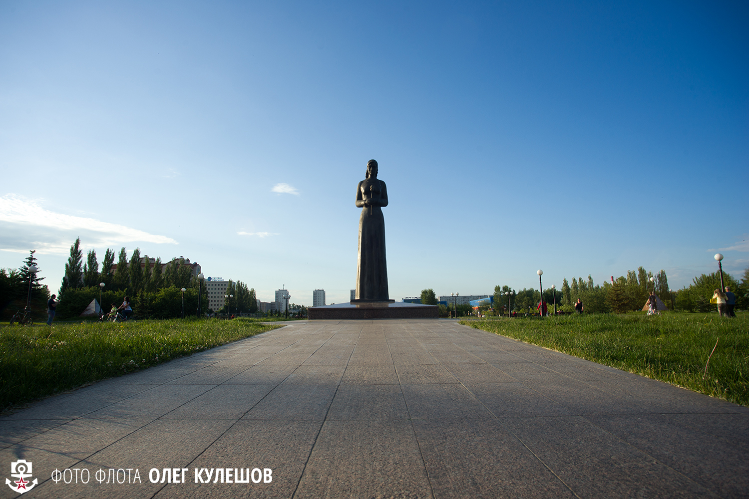 Мой нос, чувствующий, что в Казани есть что-то , связанное с флотом, завёл меня к казанскому Парку Победы, где первым, что я увидел, оказалась величественная Стела Победы. Её высота - 42 метра. У подножия стоят воин с мечом и женщина-мать с ребёнком на руках. Венчает стелу лавровый венок.