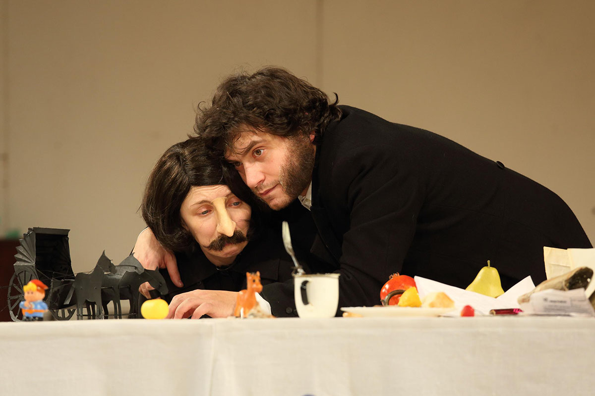 Спектакль в значительной мере решен как капустник: своими размышлениями с публикой делится карикатурный профессор из Финляндии, а для пущей наглядности заставляет сотрудников театра разыгрывать сцены из жизни двух гениев. Уборщица отбрасывает ведро и швабру, надевает крылатку и усы, унылый рабочий сцены снимает халат и приклеивает бакенбарды. Здесь есть и марионетки, и вырезанные из картона фигуры, и игра теней. Как всегда у Крымова, театр создается из подручных вещей, и все — театр; главное — фантазия.