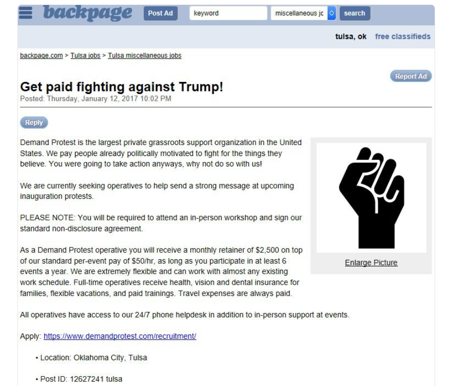 В начале января в разных городах Америки на сайте частных объявлений Backpage появилось объявление под заголовком: "Заработай на борьбе против Трампа!"