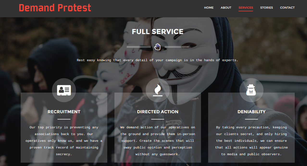 На сайте, адрес которого был указан в объявлении, говорилось, что организация берется устроить протесты против чего угодно, что секретность платным протестантам гарантируется и что акции будут выглядеть совершенно натурально для прессы и сторонних наблюдателей.