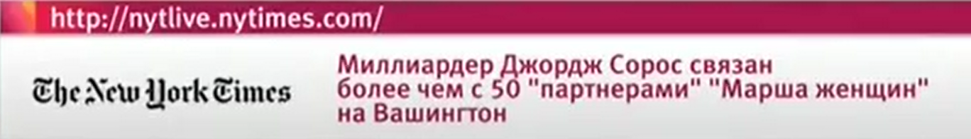 В эфире российского Первого канала была процитирована заметка журналистки Асры Номани, якобы опубликованная в газете "Нью-Йорк Таймс": "Чтобы лучше понять тех, кто вышел на марш, я не спала ночами всю неделю, изучая источники финансирования, политические установки и ключевые положения 403 групп, которые назывались "партнерами" митинга. Действительно ли это непартийный протест? Идя по следу денег, я сосредоточилась на документах миллиардера Джорджа Сороса и его благотворительной организации "Открытое общество", потому что мне стало интересно, есть ли связь между одним из крупнейших спонсоров Хиллари Клинтон и "Маршем женщин"? И я выяснила, что связей много. Сорос финансирует или тесно связан с 56 организациями, которые вышли на акцию протеста".