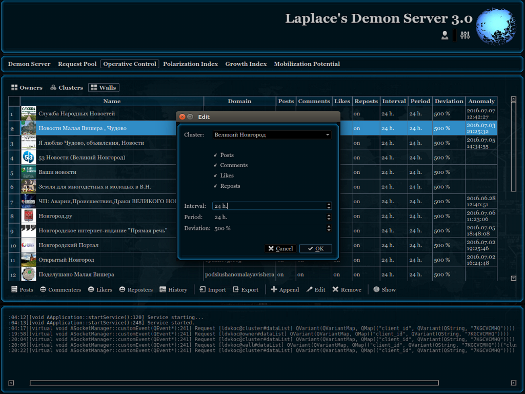 Интерфейс программы «Демон Лапласа. 3.0». Поиск популярных авторов и их публикаций «В контакте»