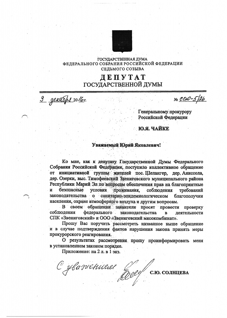 По мнению Волжского межрегионального природоохранного прокурора, ответившего на запрос депутата Госдумы от “Единой России” Светланы Солнцевой, на СПК «Звениговский» отсутствует санитарно-защитная зона. Установить ее, согласно предписанию ведомства, предприятие обязано до конца октября 2017 года.
