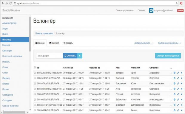 Проект «Лига волонтеров» объединяет усилия волонтеров для помощи детям, оставшимся без попечения родителей или оказавшимся в тяжелой жизненной ситуации. На данный момент активных волонтеров около 200 человек. Человек, желающий присоединиться к Лиге волонтеров, оставляет заявку на сайте фонда. Все заявки отображаются на сервере сайта, где сотрудники фонда могут видеть их, редактировать или удалять.