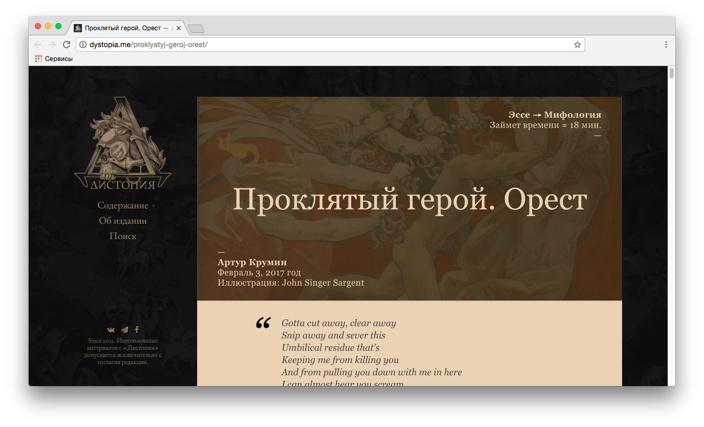 6. На сайте «Дистопия» — текст Артура Крумина об Оресте, проклятом герое античной мифологии. «Психоанализ мог бы стать другим, избери Фрейд в качестве своего мифогероя Ореста, а не Эдипа», — утверждает Крумин. Он кратко пересказывает сюжет мифа об Оресте, известный по трагедиям Эсхила и Еврипида, и прослеживает историю проклятия, которое преследует род Атридов. Мифология «Орестеи» в трактовке Крумина сводится к первобытным образам, напоминающим юнгианские архетипы. К ним же можно свести и фигуры из других «больших нарративов», мотивы которых перекликаются с «Орестеей», — Библии, шекспировского «Гамлета»; кроме того, Крумин рассматривает такие позднейшие интерпретации исходного мифа, как «Мухи» Сартра и «Розенкранц и Гильденстерн мертвы» Стоппарда: «Орест Сартра — проклятый, принявший свое проклятие. Он отвечает за преступление, соответствующее по тяжести убийству божества, которое даже не является его личным злодеянием — в нем виновен каждый человек. Он добровольно взваливает на себя бремя общечеловеческого Проклятия и как будто вполне может с ним справиться, хотя финал „Мух” умалчивает о последствиях его выбора».