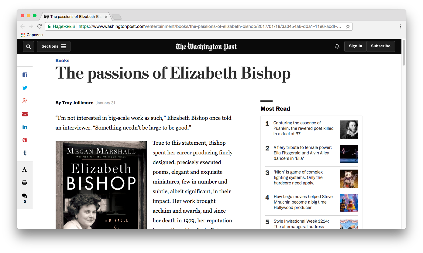 9. Вышла новая биография одной из главных американских поэтесс XX века — Элизабет Бишоп. В The Washington Post о ней пишет Трой Джоллимор: «Книга [Меган] Маршалл посвящена скорее жизни, чем литературе. А жизнь у Бишоп, как и у всех, временами была сложной и запутанной, пусть и не такой экстравагантно бурной, как у многих ее коллег. В отличие от многих поэтов — Лоуэлла, Аллена Гинсберга, Сильвии Плат, Энн Секстон, Джона Берримана и других, — она не пускала эти сложности в свои тексты: стихи лишь косвенно, шифром, указывали на них. В ее творчестве никогда не было выставления себя напоказ, а уж тем более драматизации собственной жизни. Но в глубине все равно крылась и ощутимая сложность, и подлинная драма».
