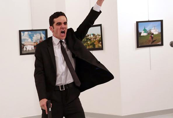 Снимок был сделан фотографом Associated Press через несколько секунд после покушения, которое произошло в Анкаре 19 декабря 2016 года: бывший полицейский Мевлют Мерт Алтынташ выстрелил в посла со словами: «Это месть за Алеппо. Мы умираем там, ты умрешь здесь. Аллах акбар!».