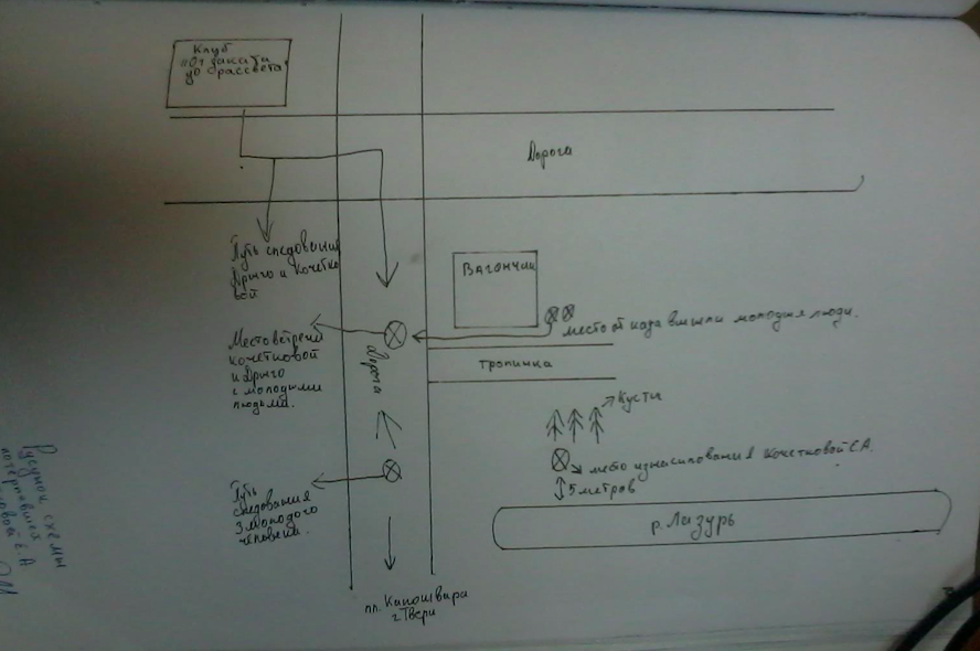Потом из-за вагончика вышел худой и высокий молодой человек, представившийся Олегом. Девушка запомнила волосатые кисти рук. Он сказал, что тоже был в клубе, но ушел оттуда раньше. Через пару минут внезапно, «как будто вышел из-за кучи земли», появился еще один молодой человек с густыми черными бровями; как показалось Кочетковой, он был «не чисто русский, а с примесью кавказской национальности». Он хотел уточнить дорогу, и пока Кочеткова ему отвечала, кто-то неожиданно ударил ее по лицу, так что девушка упала. Она слышала, как вскрикнула и попыталась убежать подруга — за ней погнался один из мужчин. «Больше ни Дарью, ни этого мужчину я не видела», — рассказывала Кочеткова.