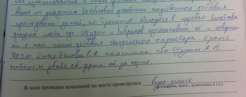 В тот же день ее показания под видеозапись проверили на месте. В конце рукописного протокола проверки, составленного следователем Магомалеевым, похожим почерком, но другой ручкой дописана фраза: «Кроме того, Кочеткова Е.А. пояснила, что Щурин А.В. пытался убить ее, душа ее за горло». На видеозаписи этих слов нет, утверждает Ирина Щурина.