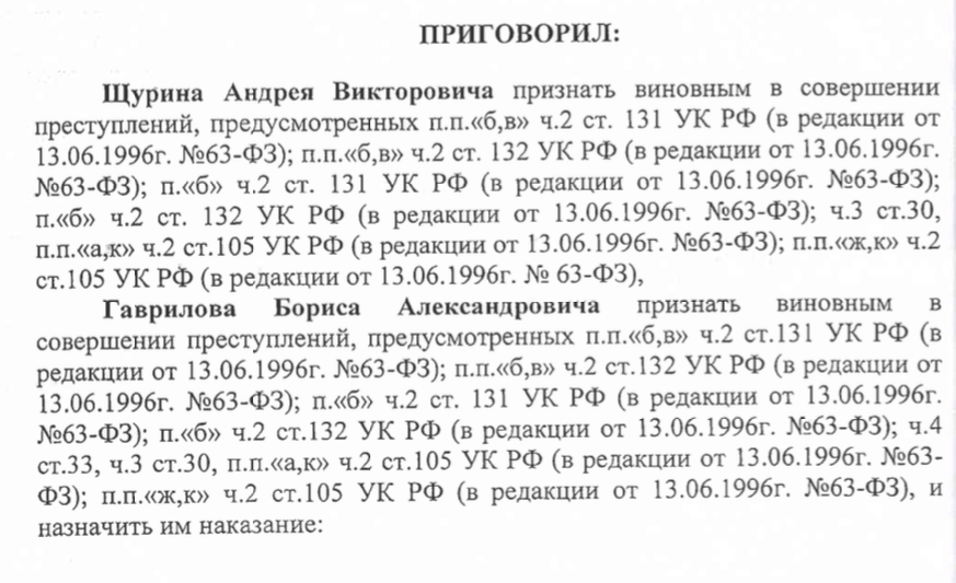 Приговор Нехаев огласил в конце декабря. Судья зачитал только резолютивную часть приговора: обоих подсудимых он признал виновными, незначительно переквалифицировав отдельные пункты обвинения. Андрея Щурина он приговорил к 20, а Бориса Гаврилова — к 18 годам в колонии строгого режима. Кроме того, суд постановил взыскать с Щурина 2 млн, а с Гаврилова 1 млн рублей в пользу потерпевшей Екатерины Кочетковой. Полный текст приговора он выдал адвокатам осужденных только месяц спустя.