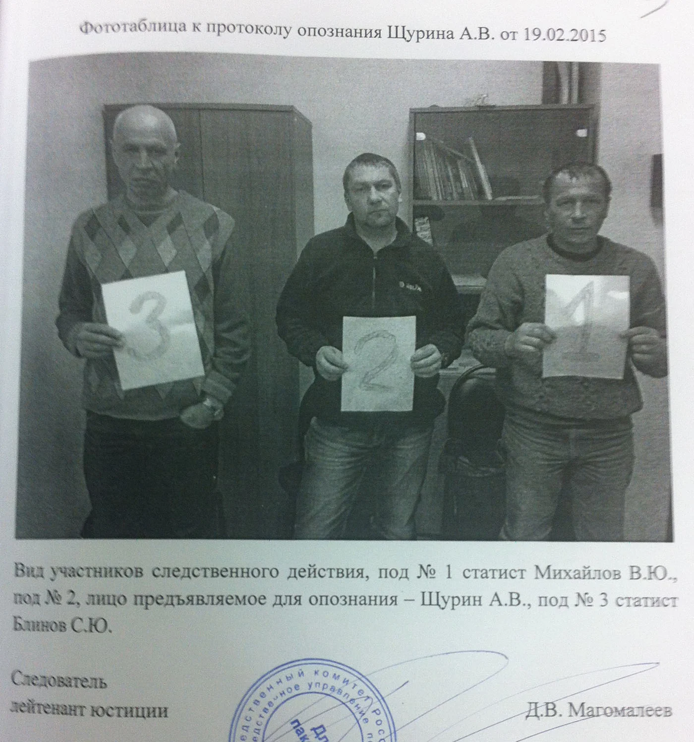 Чтобы уточнить имена и фамилии этих знакомых, задержанному пришлось звонить своему старому другу Алексею Агафонову, который в девяностых работал на той же автобазе. Вспомнив с его помощью имена Бориса Гаврилова и Евгения Шишова, Щурин назвал их следователю Магомалееву, к которому его отвезли. Он утверждает, что следователь первым делом поинтересовался: