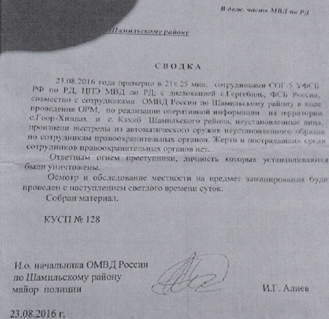 Мы отправили в МВД повторный запрос — о том, как можно объяснить это противоречие. Министр Магомедов отвечать отказался, сославшись на то, что «возбуждено уголовное дело» (по факту нападения на сотрудников полиции.— Ред.), все вопросы следует адресовать в Следственный комитет. Более того, и.о. пресс-секретаря МВД Дагестана Руслан Ибрагимгаджиев заявил мне, что никакой сводки майор Алиев не писал, и в Махачкале ее не получали. Специально для него мы публикуем копию этой сводки с личной подписью майора Алиева.