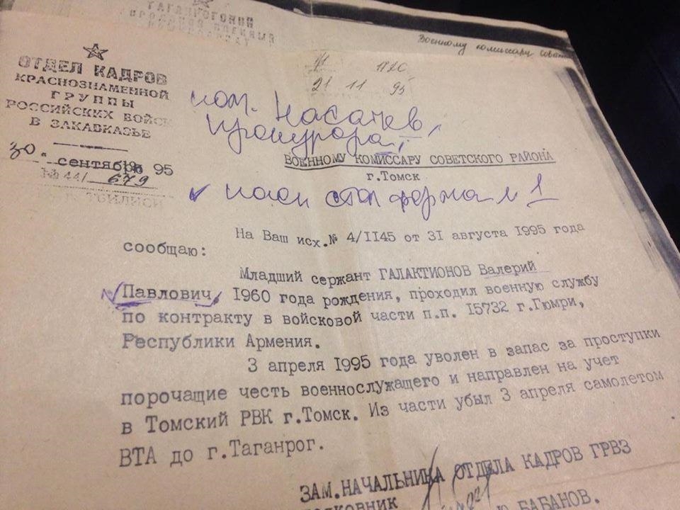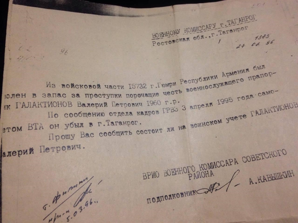 Родные Валерия пытались вернуть сына. Обращались во все инстанции и даже на телевидение. Но помощи никто им не оказал. Единственная справка, которую удалось получить семье томича за 23 года, что 3 апреля Валерий Павлович Галактионов проходил военную службу по контракту в военной части в городе Гюмри и 3 апреля уволен в запас и направлен в Томск. Из части Валерий Галактионов «убыл 3 апреля самолетом в Таганрог». Однако ни в какой Таганрог Валерий не убывал. Все это время он провел в Армении. В отделе кадров двадцать лет назад то ли про другого Галактионова написали, то ли ошиблись просто. Эта ошибка обошлась Валерию в два десятка лет скитаний.
