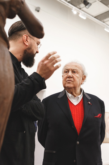 © MMOMA Зураб Церетели и Алексей Морозов Приободрившееся в последние годы в связи с событиями на Украине евразийство, лжефилософская доктрина, которой, как доброй свинье, любая ересь впрок, в художественном кредо Морозова отвечает за contemporary. То есть буквально. Вот вам салонная живопись эпохи сталинского ампира, этакий б/у Решетников, или вот салонная скульптура того же времени, облагороженная оммажем болонской ренессансной пластике, а вот автоматическая винтовка или хипстерские кеды, и сразу эрзац-академизм приобретает актуальный дискурс: исламский мир, скифы, империя, израильский милитаризм, руны — удивительно, насколько лишены воображения художники правого фланга. Казалось бы, сколько можно мусолить эту унылую мифологию, вроде бы упокоившуюся в могиле со всеми представителями отечественного постмодернизма. Те, кому никак было с ней не расстаться, переквалифицировались в комдивы. Позиция Лимонова или Прилепина гораздо честнее. Сказал — сделал. Художники, в отличие от писателей, предпочитают скандализировать публику разбросанными там и здесь скандальными словечками вроде «фасции», надеясь на немедленное возмущение, чтобы затем трусливо прятаться за толковым словарем. Вообще есть в этом какая-то неизбывная пошлость — спекулировать предрассудками, неважно, какой идеологической направленности, чтобы примерить на себя одежды маргинала. Настоящие маргиналы не числятся на государственной службе, а ведь Морозов до сих пор — ректор МАХУ памяти 1905 года.