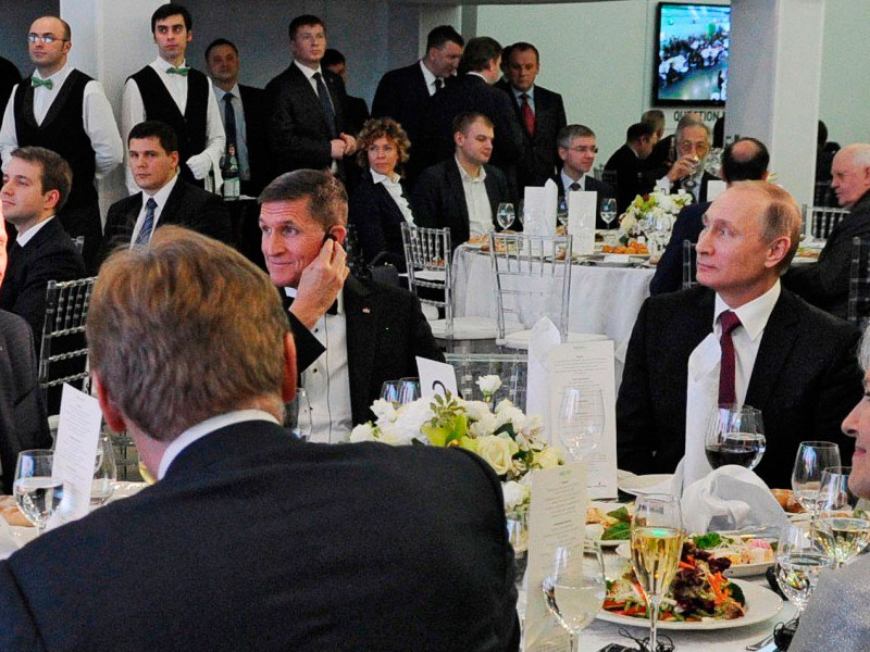 Майкл Флинн и Владимир Путин на приеме. «Для Кремля это (отставка Флинна) означает, что навсегда следует забыть о перезагрузках, сделках, разрядках, антигитлеровских коалиций и прочих его хотелках. Реакция на путинизм со стороны Америки и Запада в целом может быть только жесткой, а любой путинофильский шажок Трампа в сторону Путина будет означать для него немедленную политическую смерть», – приводит мнение политолога Андрея Пионтковского Лолита Цария, сотрудник Российской государственной библиотеки.