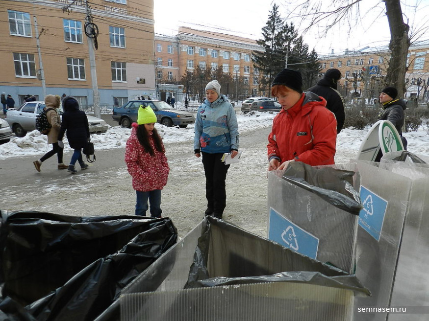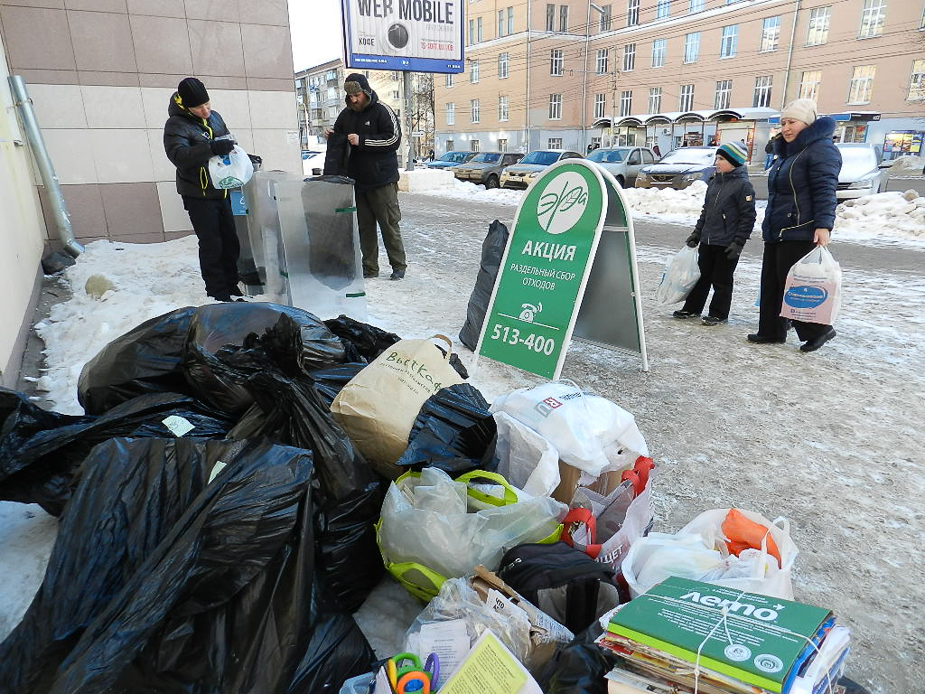 Субботнее утро, 11 часов. На этот раз экологи установили контейнеры через дорогу от здания Рязанского государственного радиотехнического университета. Для каждого вида вторсырья контейнер свой: для мягкого пластика (полиэтиленовых пакетов), для твердого пластика, для стекла, для отработанных батареек. Макулатуру складывают рядом в отдельную груду.
