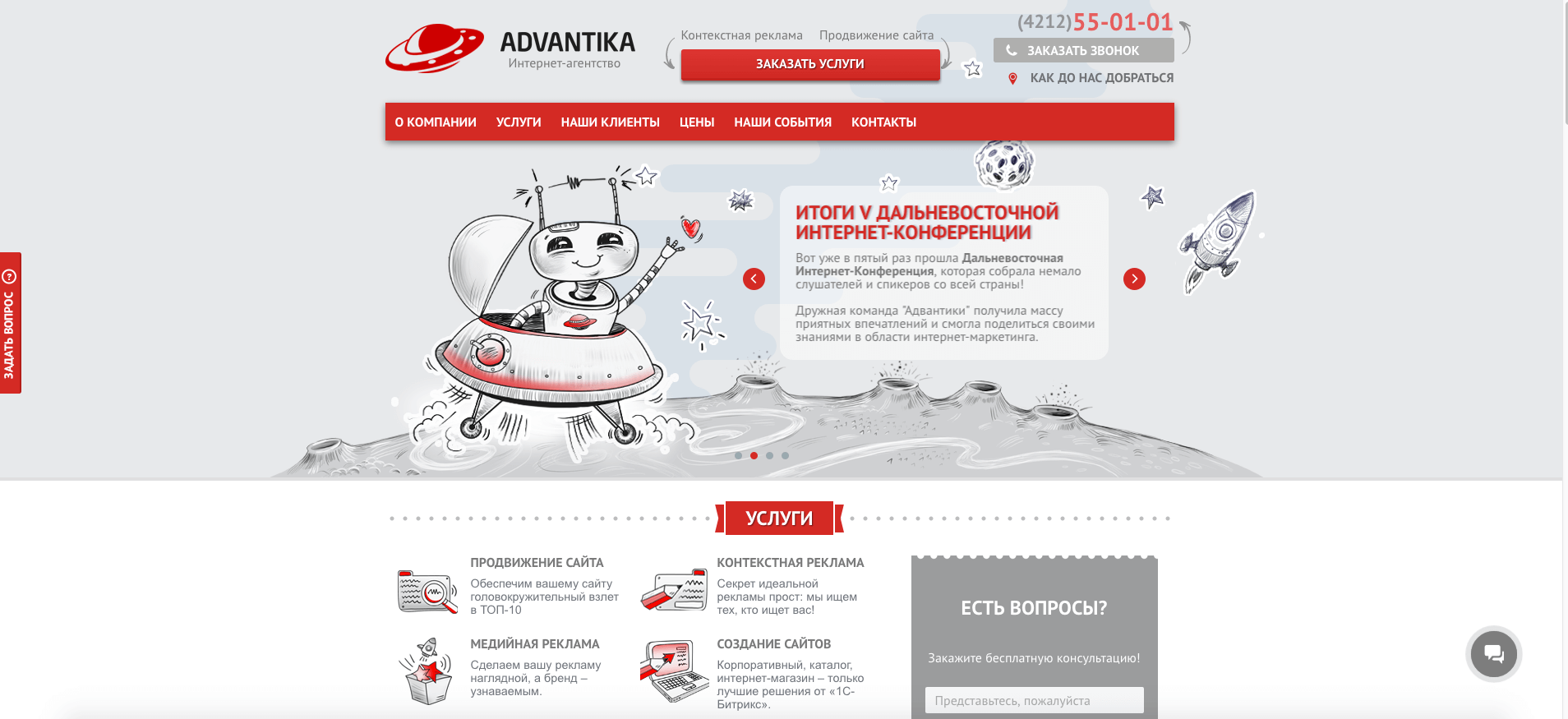 – Группа компаний «Адвантика» – крупнейшая на Дальнем Востоке компания, предлагающая комплекс услуг по продвижению бизнеса в Интернете с 2007 года. У компании есть представительства в трех городах Дальневосточного региона – Хабаровске, Владивостоке, Уссурийске. Сегодня мы предлагаем нашим клиентам профессиональное поисковое продвижение, разработку и сопровождение сайтов, все виды интернет-рекламы.