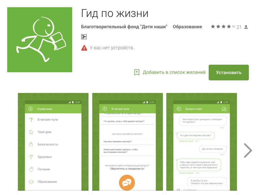 Но сегодня молодые люди пользуется смартфонами, а не печатными изданиями. Поэтому было создано бесплатное мобильное приложение «Гид по жизни» – электронная версия путеводителя с расширенными функциями. Основные функции приложения работают без доступа к Интернету.
