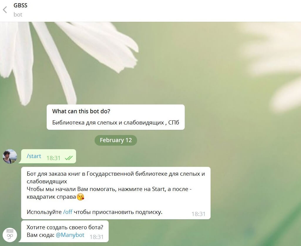 В сервисе Telegram появился бот для заказа книг из библиотеки. Бот был создан для Санкт-Петербургской государственной библиотеки, которая предоставляет свои услуги слепым и слабовидящим людям.