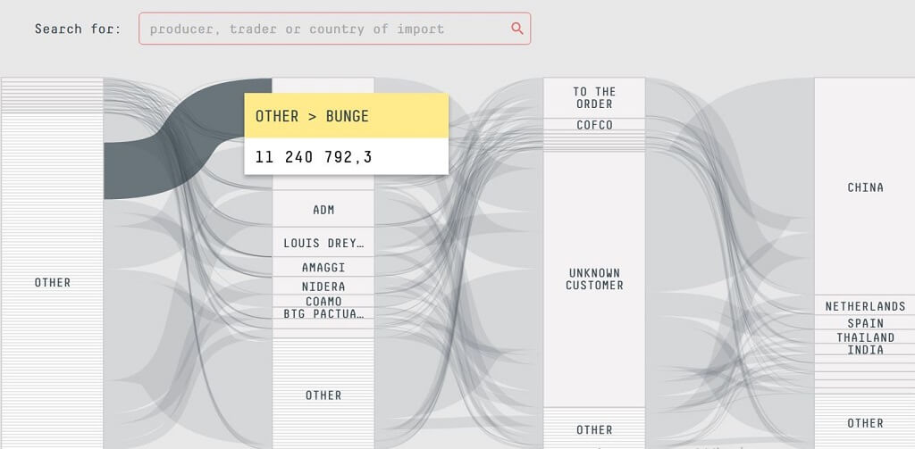 Что еще может дать Trase общественникам, активистам, журналистам и расследователям? Проект предоставляет возможность поиска по своей базе данных — если ввести название интересующей компании, можно увидеть информацию о том, где именно она берет сырье для своих товаров и на каких рынках ее продукция продается. Искать также можно по интересующему географическому региону – тогда Trase предоставит информацию о том, кто закупает сырье, произведенное на этой территории, и куда оно отправляется.