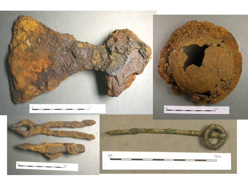 Также нашлось немало предметов, которые были уложены в погребальную ладью вместе с телом умершего. Среди них были большой железный котел с рукояткой, медный черпак, верхняя часть медного питьевого рога, меч с украшениями из серебряной и медной проволоки на рукоятке, клинок которого был завернут в ткань, топор с широким лезвием, железный серп, точильный брусок из сланца, скреплявшая одежду медная булавка, щипцы, молоток. Предварительный анализ позволил датировать находку концом IX – началом X века. При погребении тело и инвентарь были уложены в небольшую ладью, а сверху был насыпан курган и сооружена каменная насыпь.