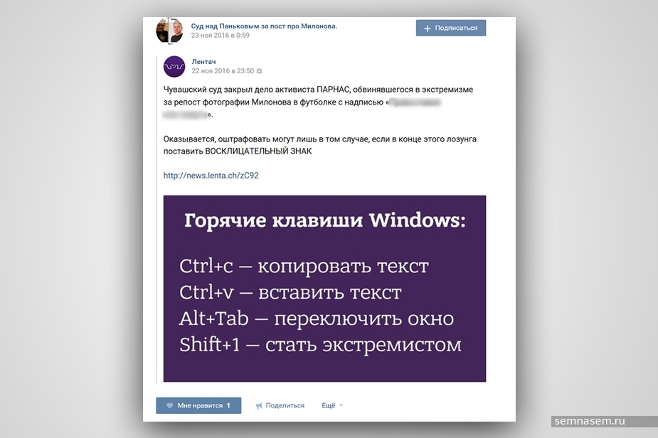 In November 2017, according to Glukhov, the court acquitted the activist Dmitry Pan’kov as a slogan in his repost did not contain an exclamation point, and could be different from the extremist slogan of the Ministry of Justice registry. More than 270 accounts in the social network "VKontakte" distributed news on closing the case of Pan'kov.
