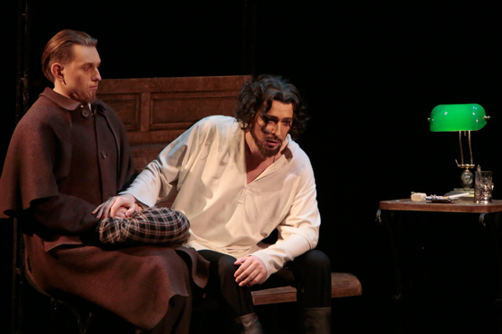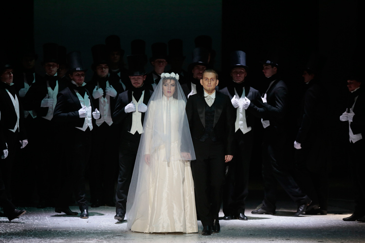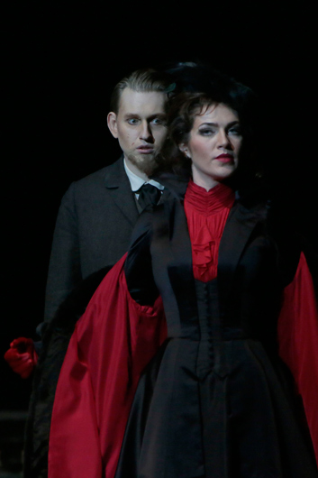 Публика воспринимает новую партитуру, все же подсокращенную примерно на час, с увлеченностью, в антракте не уходит. Спектакль, поставленный на Новой сцене новичком в опере, опытным худруком израильского театра «Гешер» Евгением Арье и питерским сценографом Семеном Пастухом, не претендует на новые резкие акценты в трактовке романа Достоевского или любовного четырехугольника, на котором сконцентрировались композитор и либреттист. Кинематографичность оперы, где динамично монтируются разные эпизоды, ведет постановщиков за собой. Видео Аси Мухиной с крупными планами главных действующих лиц добавляет стереофоничности. Приветы от Гоголя и Чехова чудятся в декоративно-гротесковых силуэтах массовки. Черно-бело-красный антураж хоть и немножко из 90-х, но технично вставлен в повествование, полное страстей, что называется, на разрыв аорты и нежного сновиденческого морока. И польский дирижер Михал Клауза очень хорошо высвечивает эти контрасты.