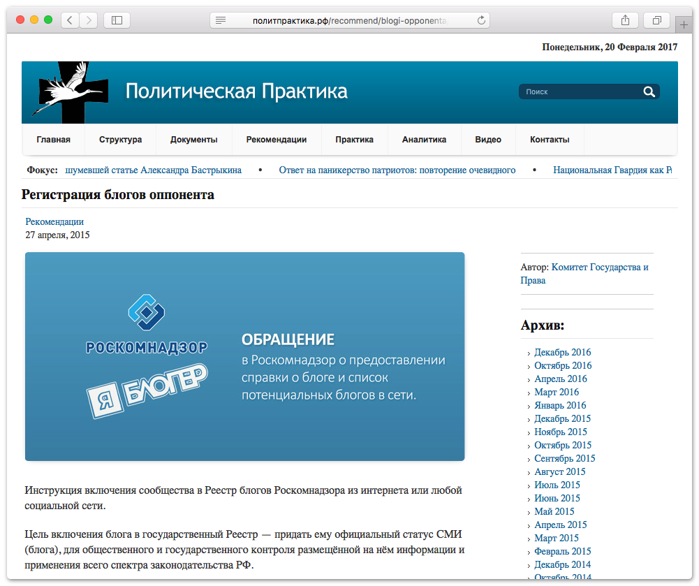 Один из проектов «Политической практики» называется «Регистрация блогов оппонентов». Он предлагает всем желающим внести страницу в социальных сетях в государственный реестр блогов, который ведет Роскомнадзор: это накладывает на автора блога те же законодательные ограничения, что и на СМИ (сделать это по закону может кто угодно; авторов блогов о регистрации в реестре не уведомляют).