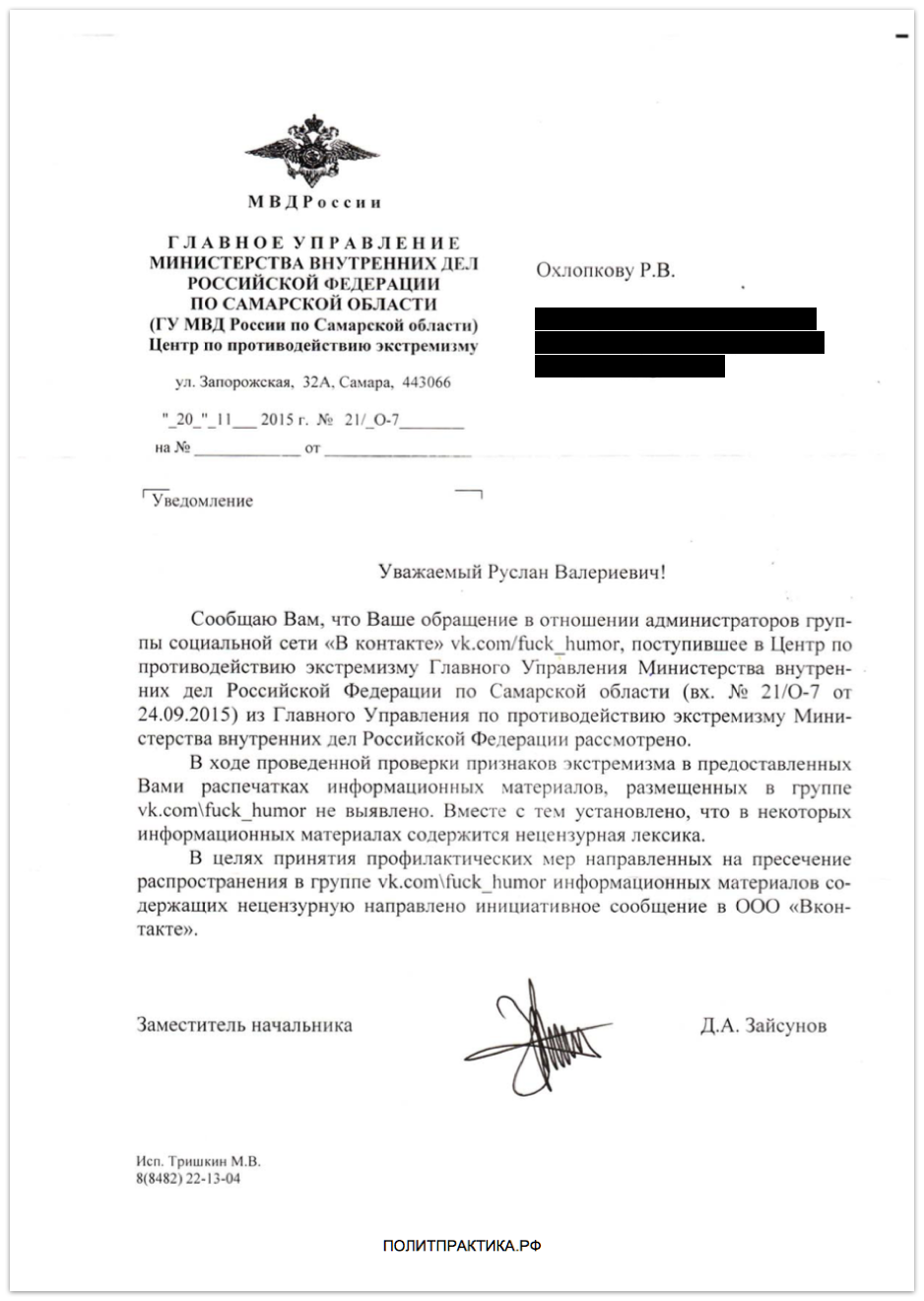 Персональные данные авторов заявлений в большинстве случаев закрашены. Однако в ряде ответов официальных органов сохранились обращения «Уважаемый Руслан Валериевич», а также указания о пересылке обращений в органы прокуратуры и Роскомнадзор по адресу заявителя — в Самарскую область.