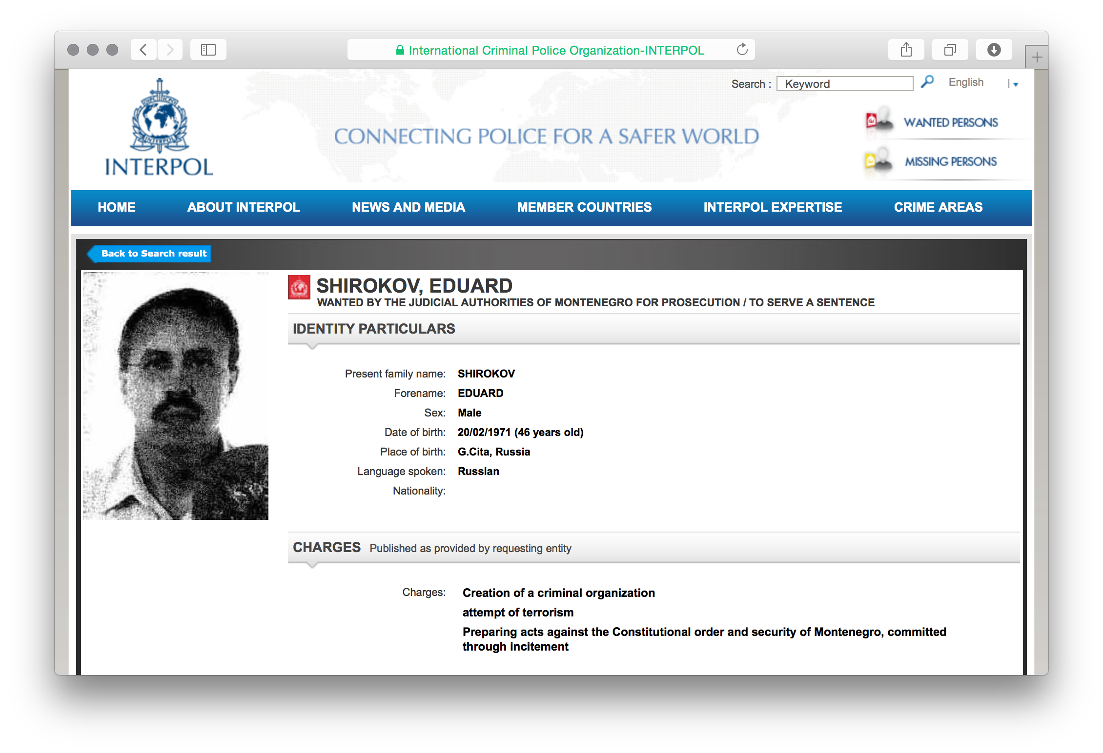 По версии прокуратуры Черногории, группа заговорщиков планировала переворот в стране; 16 октября 2016 года они собирались убить премьер-министра Мило Джукановича. Одним из подозреваемых черногорские власти назвали Эдуарда Широкова. Под этой фамилией он объявлен в розыск через Интерпол. В базе Интерпола есть его фотография.