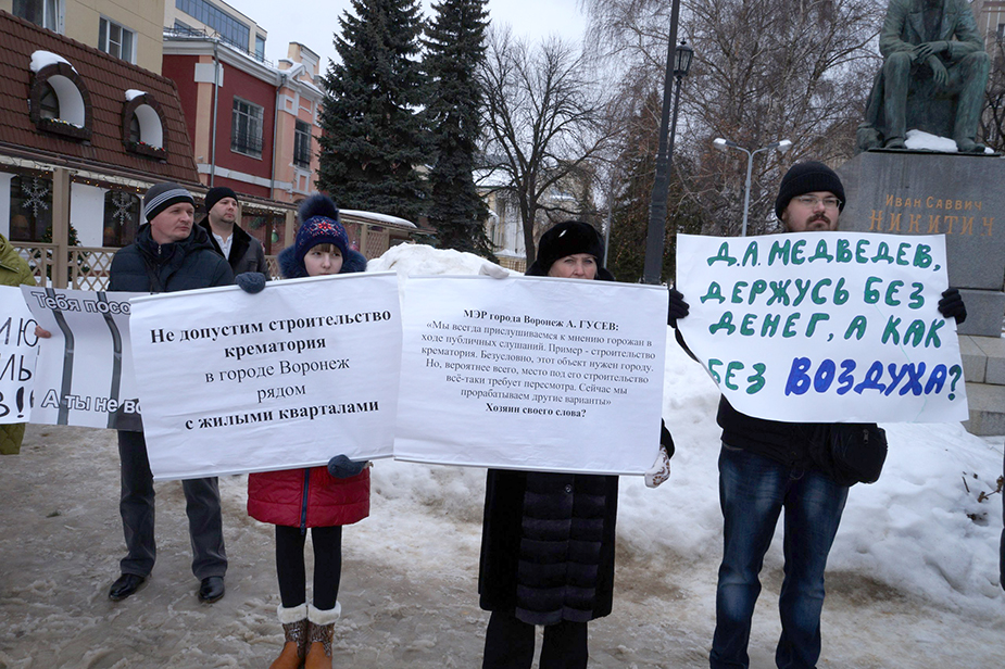 Воронежцы выступают против строительства крематория на улице 9 января. По их словам, он будет негативно влиять на экологию близлежащих жилых микрорайонов, в одном из которых находится детский сад. Протестующие опираются на позицию церкви по этому вопросу, которая не одобряет кремацию.
