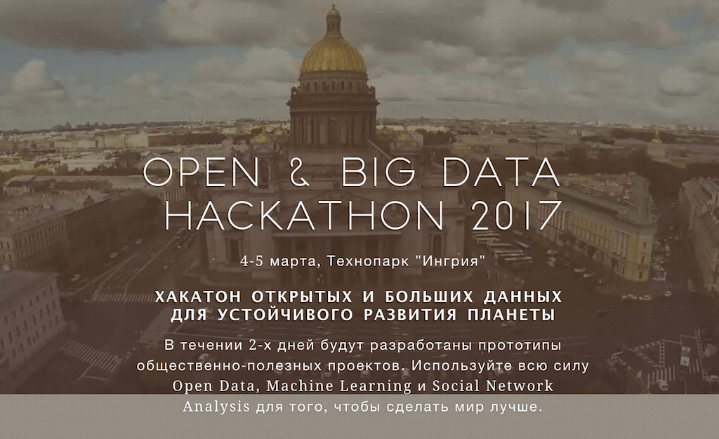 Фонд «Открытый город» и Теплица социальных технологий в Международный день открытых данных 4-5 марта 2017 года проведут в Санкт-Петербурге ежегодный хакатон «Открытые и большие данные для устойчивого развития». Приглашаем принять участие специалистов по открытым данным и визуализации информации. Специалистам из других городов возмещаем транспортные расходы и расходы на проживание (число мест ограничено).