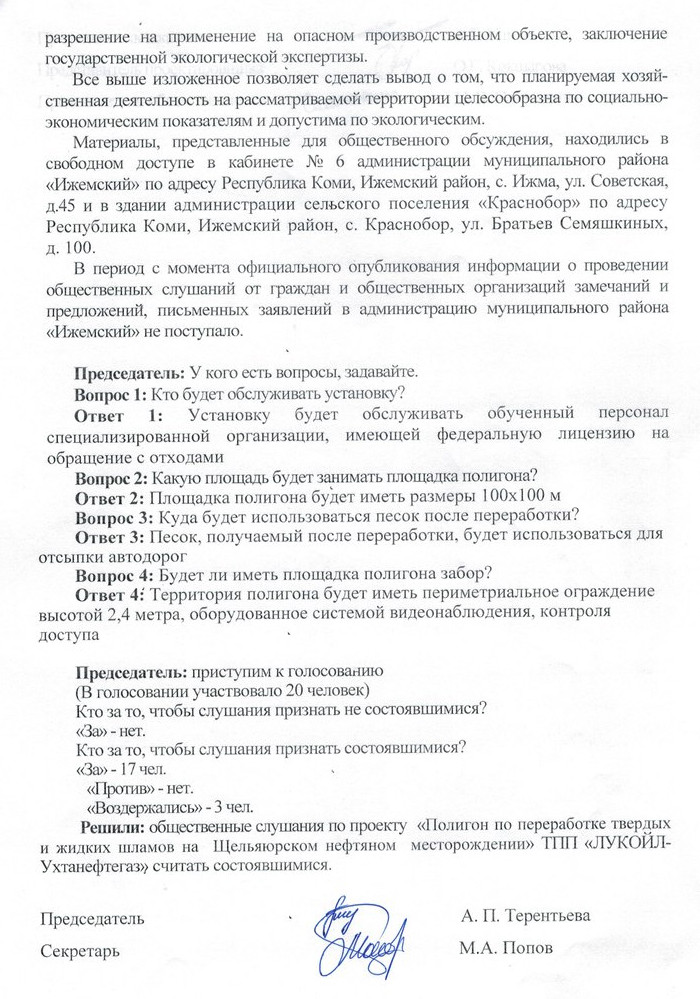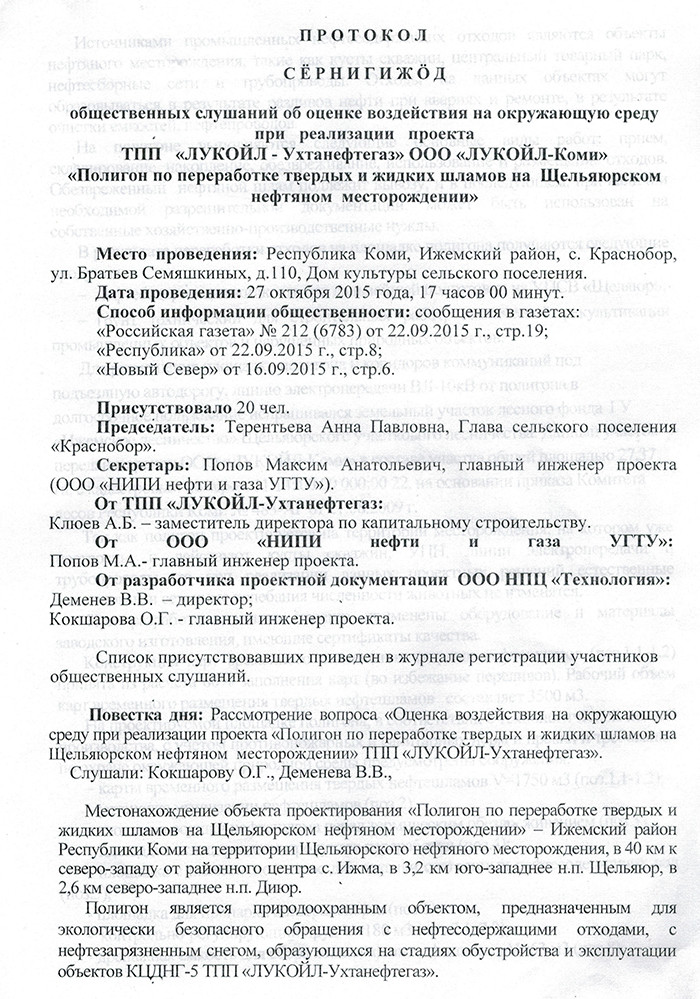1. Потребовать от «Лукойла» немедленно приостановить строительство шламонакопителя до 5 марта. Пригласить на 5 марта на такое же собрание в Щельяюре представителей «Лукойла», которые уполномочены решать вопрос по переносу шламонакопителя.