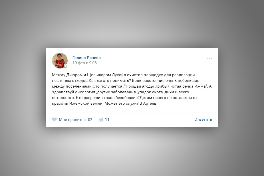 — Когда мы в интернете подняли этот вопрос [о строительстве шламонакопителя], я не думала, что будет такой ажиотаж. Мы договорились подойти к 10 часам к администрации поселка в понедельник 13 февраля и спросить у главы, на каком основании все это и почему население узнает [о строительстве] только сейчас. Когда мы написали о своей инициативе [во «ВКонтакте»], вылезло сообщение, что к нам едут представители «Лукойла» и будет собрание в Доме культуры. Тогда мы напечатали листовки, а молодежь быстро их разнесла.