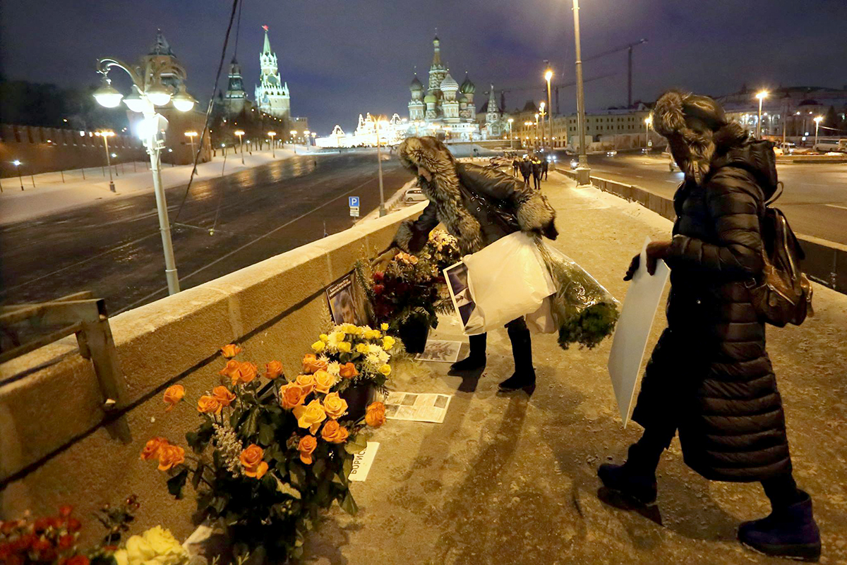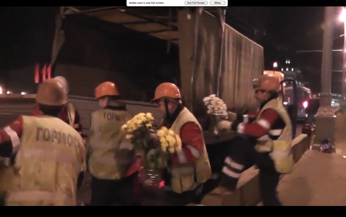 Ночь. Вид на Кремль с моста невероятен: подсвеченные прожекторами, плывут маковки колоколен соборов Кремля, внизу чернеет незамерзающая Москва-река, мимо цветов и портретов идут люди. Кто-то проходит, пряча глаза, кто-то кивает в знак солидарности, кто-то останавливается, заводит разговор о Немцове. Нет-нет да тормозят машины: опускаются стекла, люди смотрят на цветы и портреты.