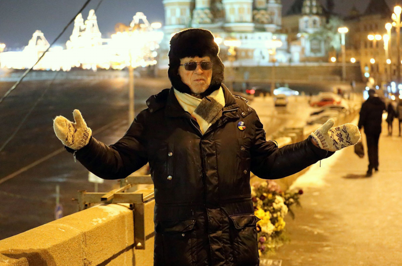 Это 719-й день со дня смерти Бориса Немцова. 9 часов вечера. Холодно и дует ветер. На Большом Москворецком от силы три-четыре ведра с букетами — розы, гвоздики, хризантемы, три портрета Немцова, свечи. Накануне была очередная зачистка — люди в спецовках с надписью «ГБУ» забрали все, подчистую. Борис Федорович Казадаев, член партии ПАРНАС, одним из сопредседателей которой был Немцов, приходит на мост «так часто, как бьется сердце». То есть — каждый день. Первый раз пришел на мост утром той ночи, когда убили Немцова: с тех пор это его пост. Борису Федоровичу 73 года, когда-то работал на заводе ЗИЛ, Немцова знал — приходил на семинары и мероприятия, участвовал в предвыборной кампании Навального 2013 года. Сегодня, говорит Борис Федорович, заступил в 7 вечера, уйдет в полночь — все строго по расписанию. «Я одет достаточно тепло, но всю ночь стоять не могу, возраст не тот, да и на метро надо успеть», — объясняет он.