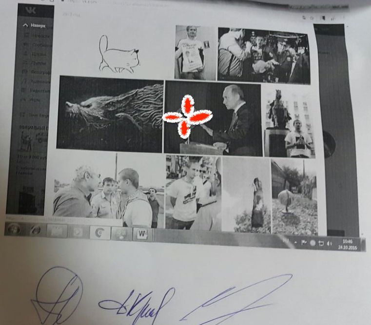 После трёх лет поисков в социальной сети Вконтакте сотрудники центра Э в феврале 2015 года ее обнаружили, а в декабре 2016 г. заместитель прокурора Прикубанского округа, несмотря на то, что страница в ВК с этой злосчастной фотожабой была мною удалена, возбудил административное дело и передал его в суд.