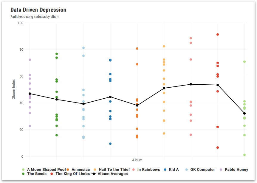Томпсон получил и проанализировал эти данные с помощью языка программирования R. Самой мрачной песне он присвоил индекс равный одному, а самой позитивной — 100, после чего расставил остальные композиции между ними.