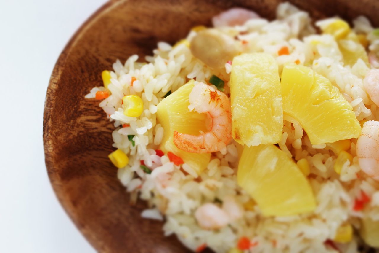 Классика тайской кухни, с небольшими вариациями популярная и в соседних странах — Малайзии, Сингапуре, Камбодже. Особенно эффектно выглядит в традиционном варианте подачи: целый ананас разрезают пополам, мякоть используют для приготовления, а готовый рис выкладывают горкой в пустые половинки ананаса.