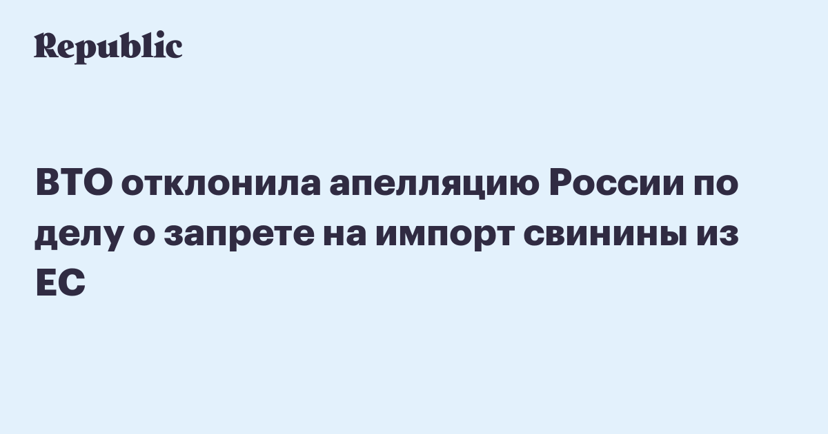 Всемирная торговая организация (ВТО) отклонила апелляцию России на решение о признании незаконным введенный в 2014 году запрет на импорт свинины из ЕС. Об этом сообщает Reuters.
