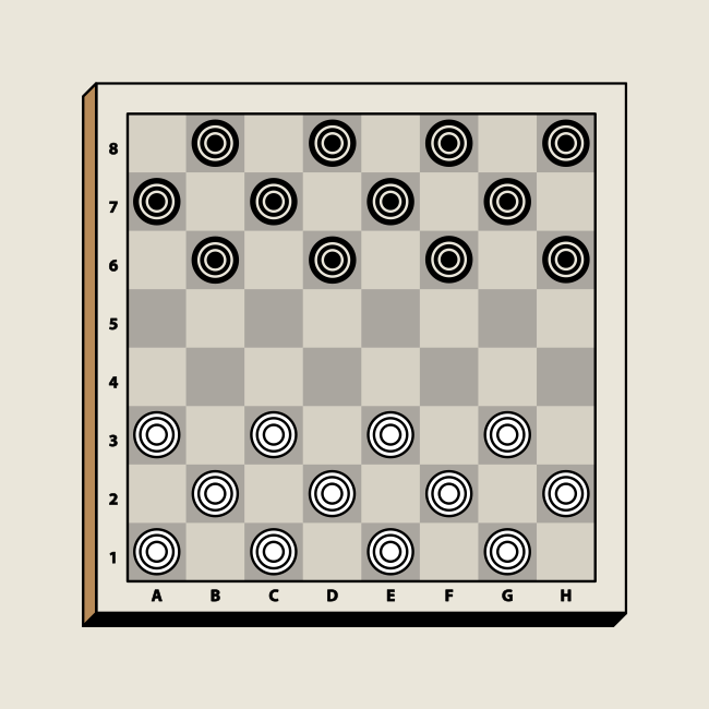Если вам повезло и вы играете белыми, важно сделать хороший первый ход. Самые популярные ходы в начале партии такие: c3 — d4 и c3 — b4. Е3 — d4 и g3-f4 тоже хорошие ходы, после них черные не могут получить подавляющего преимущества. Ход «на борт» (g3- h4) — играется, но после него не стоит особенно рассчитывать на хороший результат. Ход a3-b4 тоже не очень хороший: белым приходится защищаться и шансов победить немного. А самый слабый ход: e3-f4 — он закупоривает все шашки. Это «столбовой» ход, который не дает развиваться.