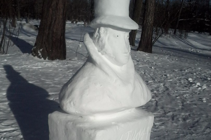 Жители Пушкина слепили в Александровском парке снежную скульптуру поэта Пушкина. Фото снеговика появилось в воскресенье в соцсетях.